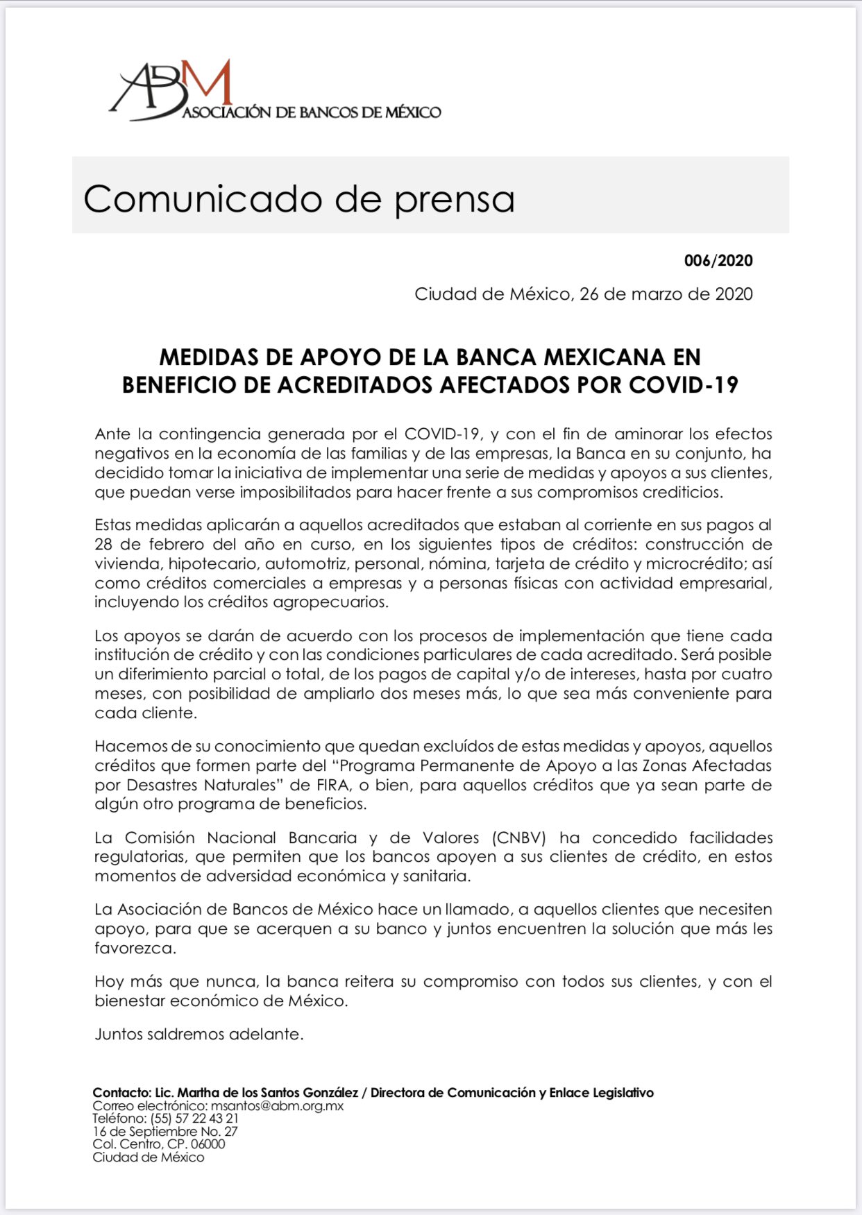 Apoyo de la Banca Mexicana a Cuentahabientes por Coronavirus